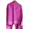 This Banarasi brocade features a refined arrangement of floral motifs set in a structured grid, offering balance and rhythm across the central field. The borders are intricately woven with scrolling vines and stylized florals, culminating in a wider decorative band that anchors the composition. A row of tassels along the lower edge adds movement and ceremonial charm. Though machine-crafted, the textile retains the visual depth and cultural resonance of traditional Banarasi design—ideal for draping, décor, or curated display.