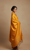 This Banarasi brocade features a refined arrangement of floral motifs set in a structured grid, offering balance and rhythm across the central field. The borders are intricately woven with scrolling vines and stylized florals, culminating in a wider decorative band that anchors the composition. A row of tassels along the lower edge adds movement and ceremonial charm. Though machine-crafted, the textile retains the visual depth and cultural resonance of traditional Banarasi design—ideal for draping, décor, or curated display.